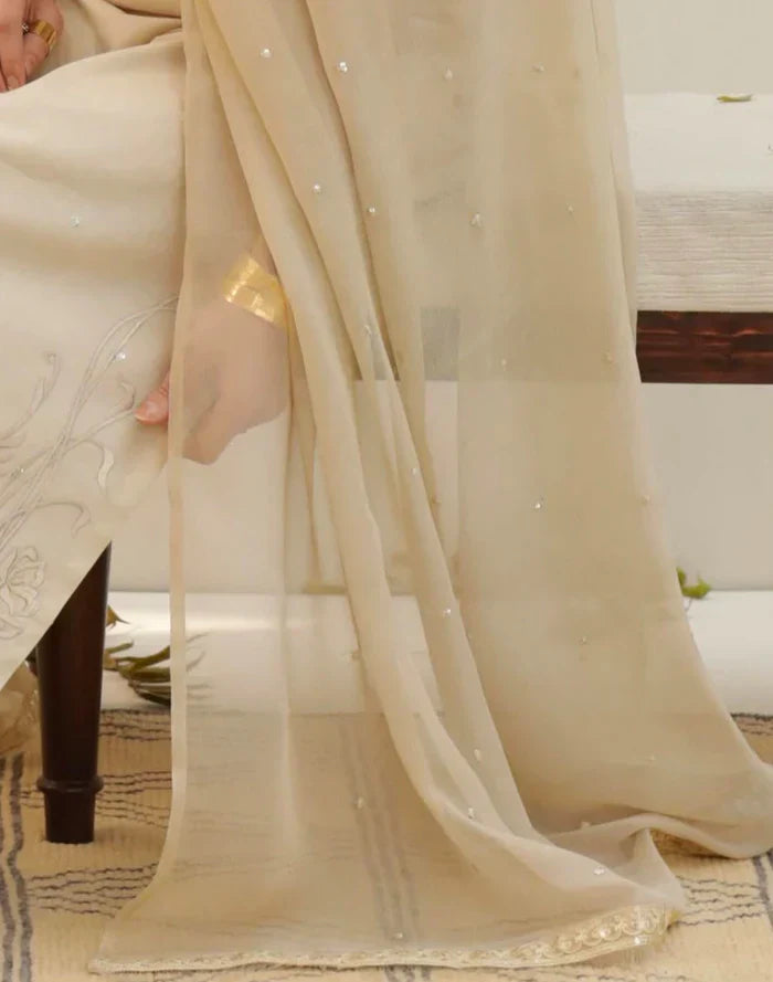 Where elegance meets ease, Beige Whisper is a timeless soft beige ensemble perfect for spring and summer semi-formals. Crafted from premium lawn, the straight-cut shirt features delicate floral embroidery with a subtle shimmer and fringed finish. It's paired with coordinated trousers and a sheer organza dupatta adorned with light sequin embellishments, adding just the right touch of festive charm.