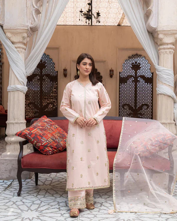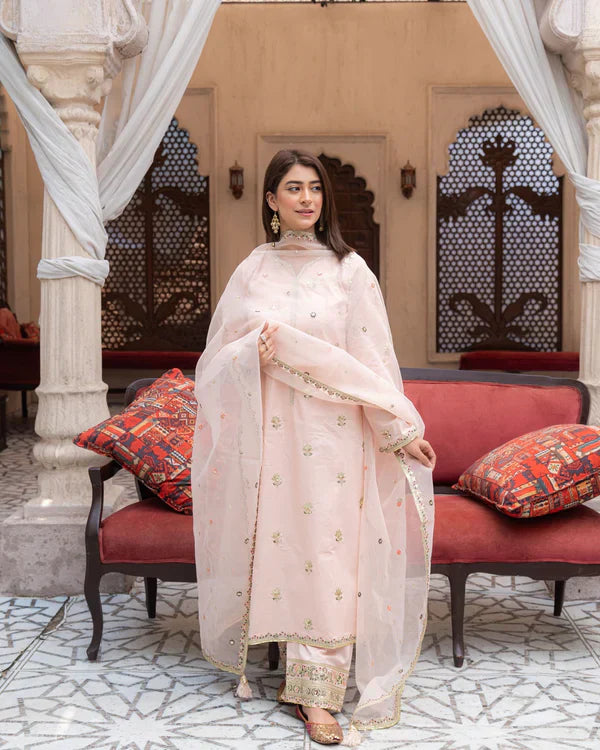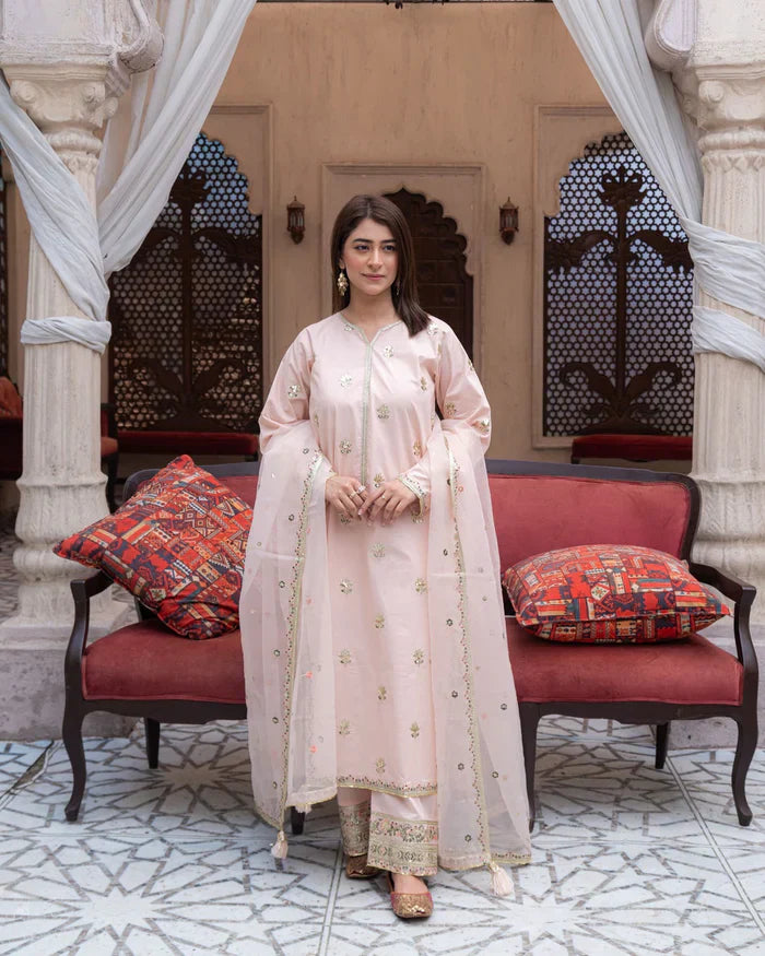 Blushed Pink – Embrace graceful charm with Blushed Pink, a stunning three-piece stitched suit in a soft powder pink shade. Crafted from premium lawn, the shirt and trousers feature delicate floral sequin embroidery for a refined, feminine look. Paired with a sheer embroidered organza dupatta with embellished borders, this ensemble is perfect for Eid, daytime weddings, or elegant gatherings.