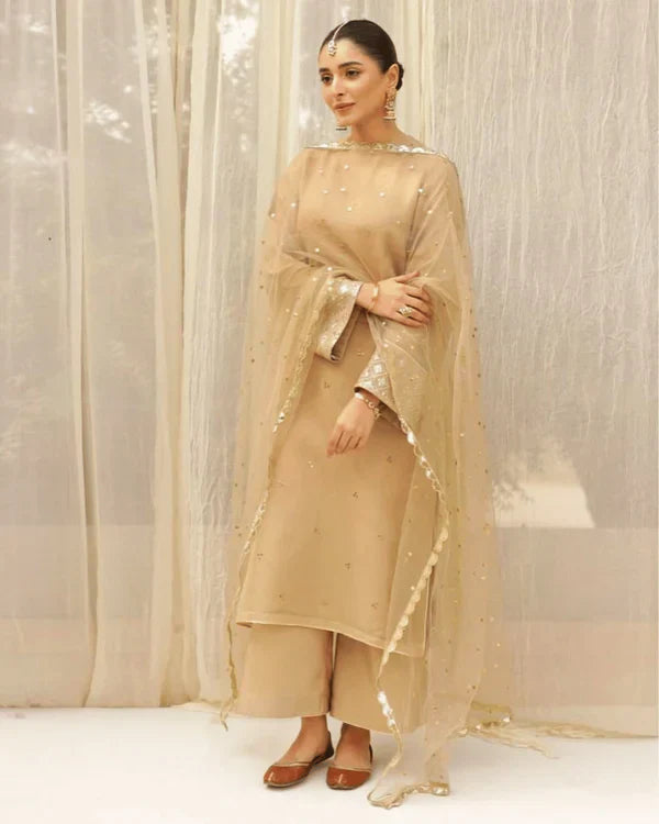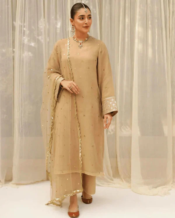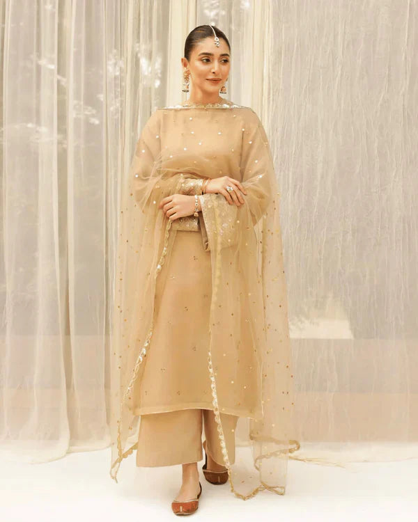 The shirt features exquisite embroidery, while the sheer organza dupatta is adorned with delicate threadwork and subtle sequins, adding a regal shimmer. Paired with coordinated trousers for effortless comfort and style.