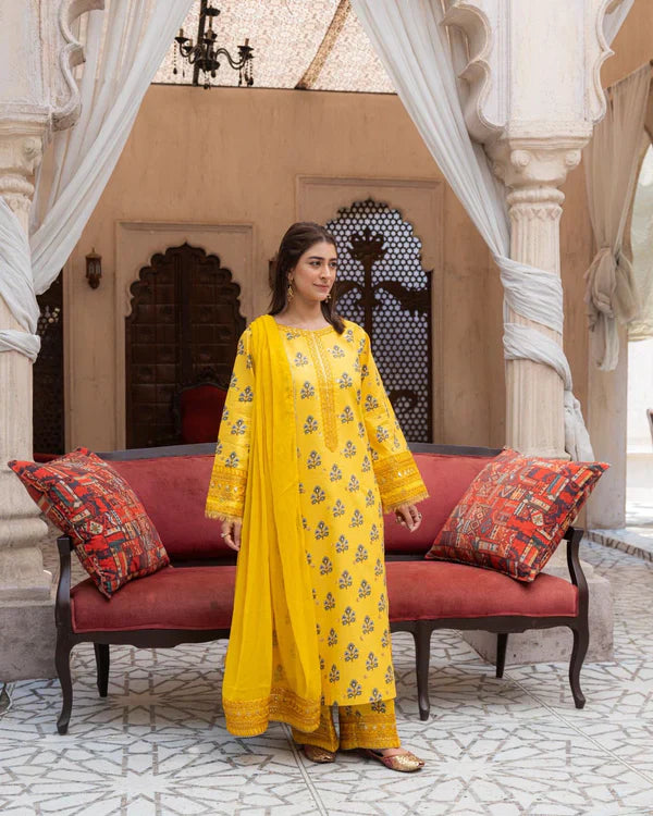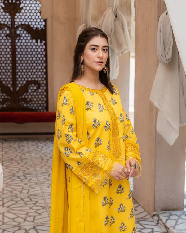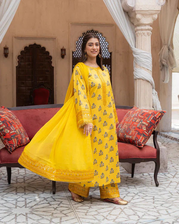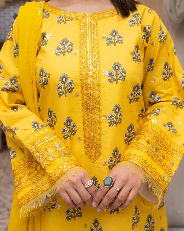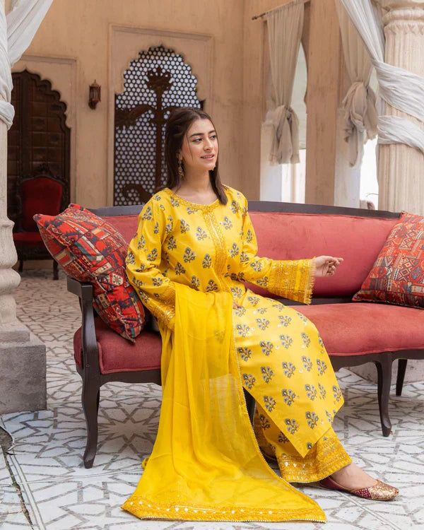 Brighten up your look with Sunlit Bloom, a soft yellow outfit inspired by the charm of blooming marigolds. Made from premium printed lawn, the shirt and trouser feature elegant sequin embroidery on the neckline, sleeves, and hem, adding a gentle sparkle. Paired with a light chiffon dupatta, this suit is perfect for festive days or cheerful daytime events.